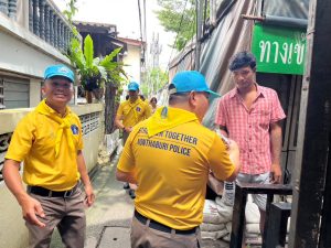 2. ตรวจเยี่ยมประชาชน ที่พักอาศัยอยู่บริเวณนอกคันกั้นน้ำ ริมฝั่งแม่น้ำเจ้าพระยา สอบถามปัญหาความเดือดร้อนและ แนะนำวิธีการ ป้องกันอาชญากรรม แจก แผ่นพับ สติ๊กเกอร์หมายเลขด่วน โดยรับแจ้งว่า สถานการณ์น้ำยังปกติ มีน้ำขึ้น บ้างเล็กน้อย ช่วงเวลา 19:00 น และ น้ำลงสู่สภาวะปกติเวลา 23:00 น ของทุกวัน