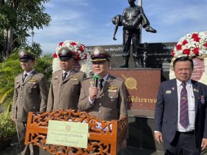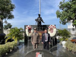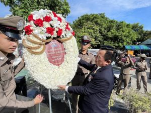 ผกก.สภ.เมืองนนทบุรี และประธาน กต.ตร.สภ.เมืองนนทบุรี ร่วมวางพวงมาลาหน้าอนุสรณ์รายนามข้าราชการตำรวจที่เสียชีวิตขณะปฏิบัติหน้าที่