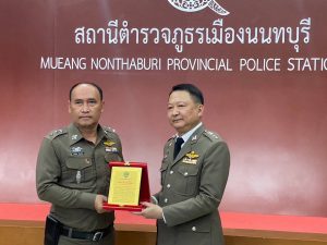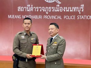 ผกก.สภ.เมืองนนทบุรีมอบโล่ ให้แก่ผู้ทำคุณประโยชน์ต่อสภ.เมืองนนทบุรี และมอบใบประกาศณียบัตรแก่ข้าราชการตำรวจที่ปฏิบัติหน้าที่ดีเด่นในแต่ละด้าน เพื่อเป็นขวัญและกำลังใจต่อไป
