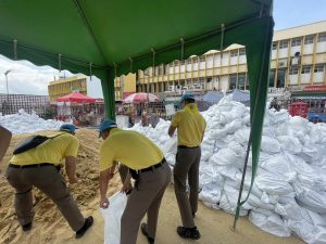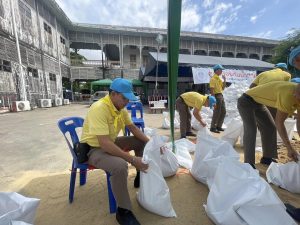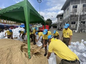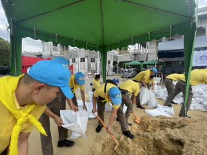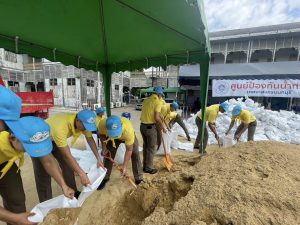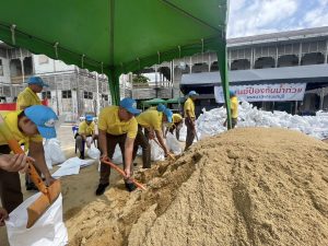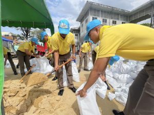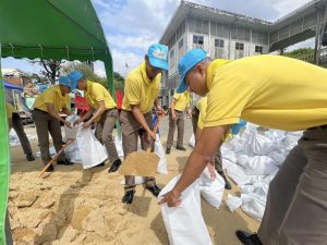 นำข้าราชการตำรวจจิตอาสา สภ.เมืองนนทบุรี จำนวน 11 นาย ร่วมกับเทศบาลนครนนทบุรี เตรียมความความพร้อมรับมือภัยพิบัติน้ำท่วม โดยการร่วมกันนำทราย บรรจุใส่ถุงกระสอบ เพื่อจัดทำเขื่อนกระสอบทรายกั้นน้ำป้องกันน้ำท่วม ณ ศาลากลางจังหวัดนนทบุรี (หลังเก่า) ต.สวนใหญ่ อ.เมือง จ.นนทบุรี