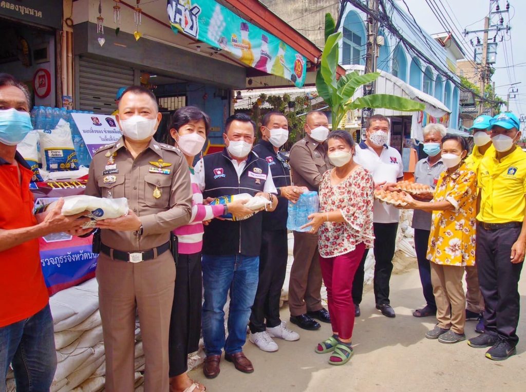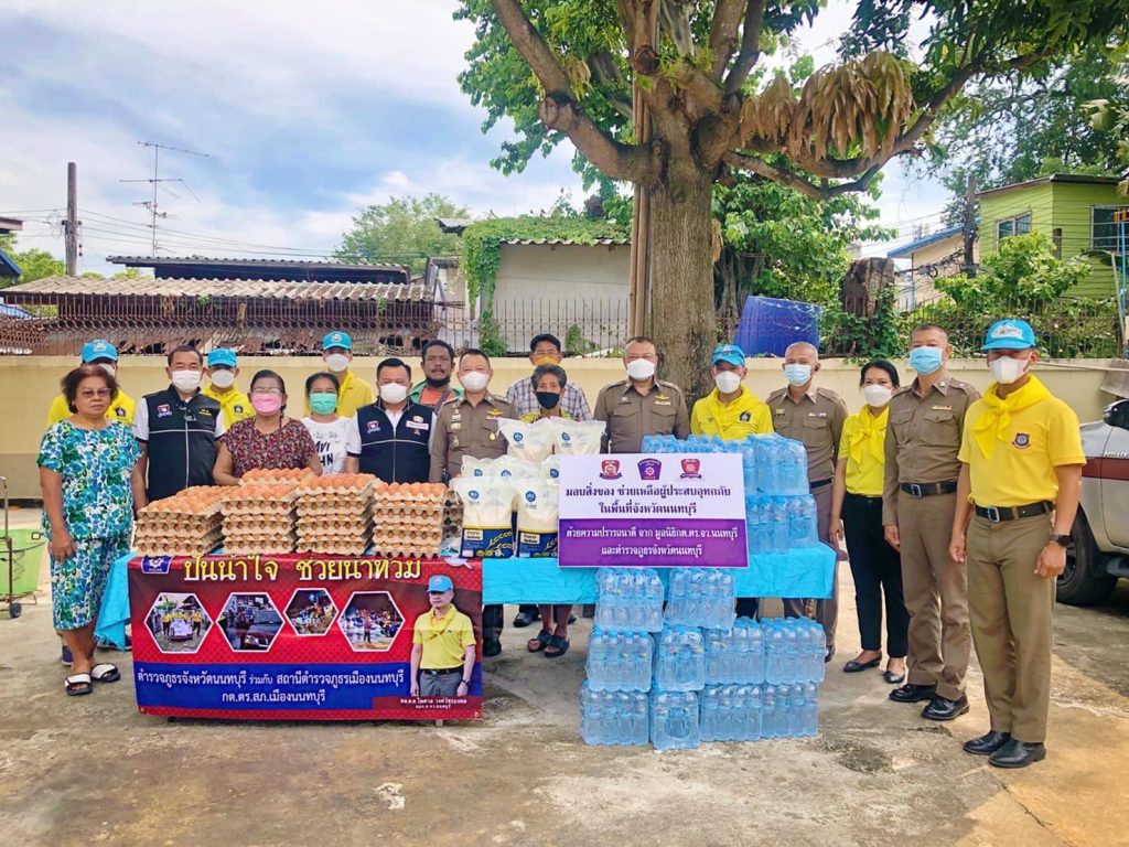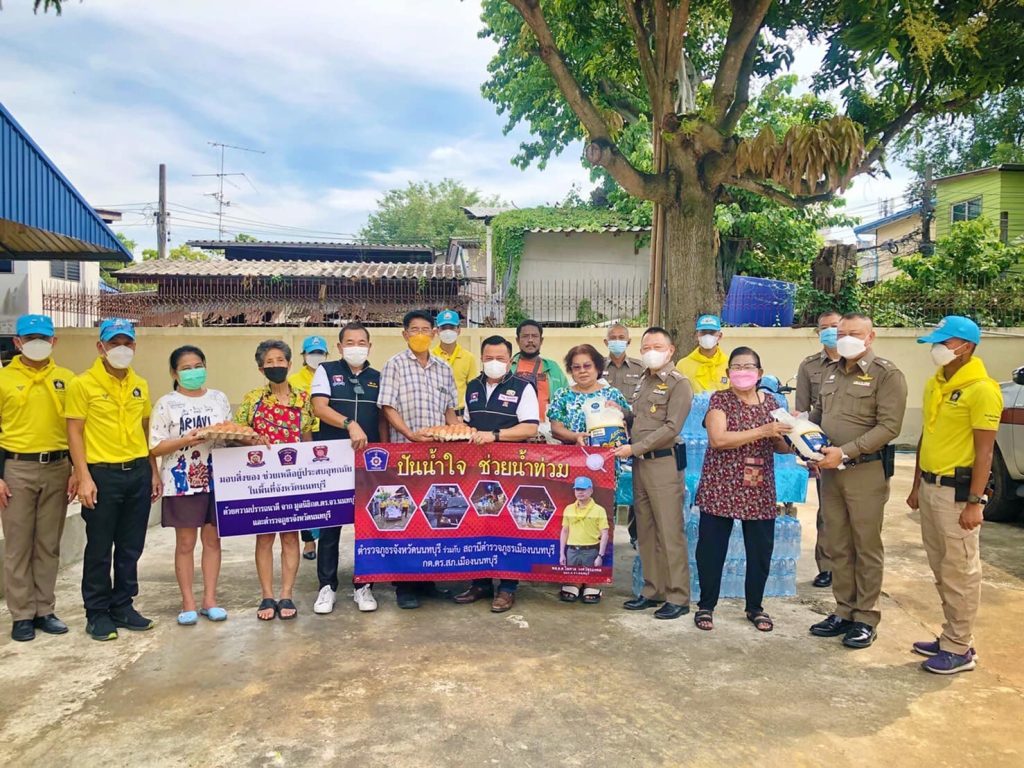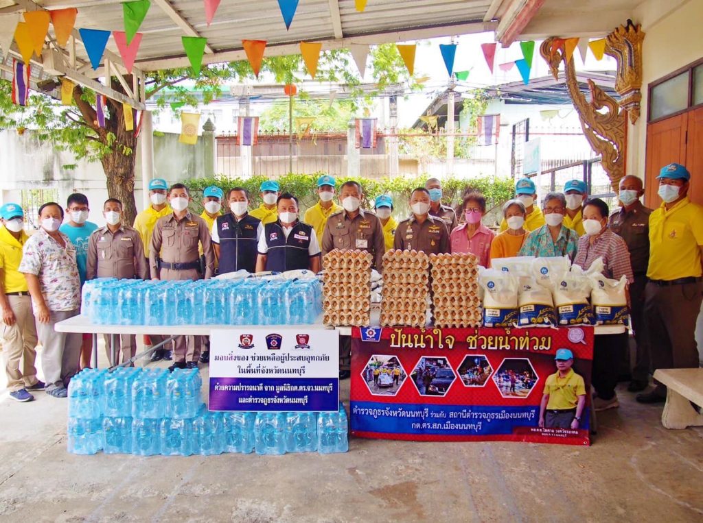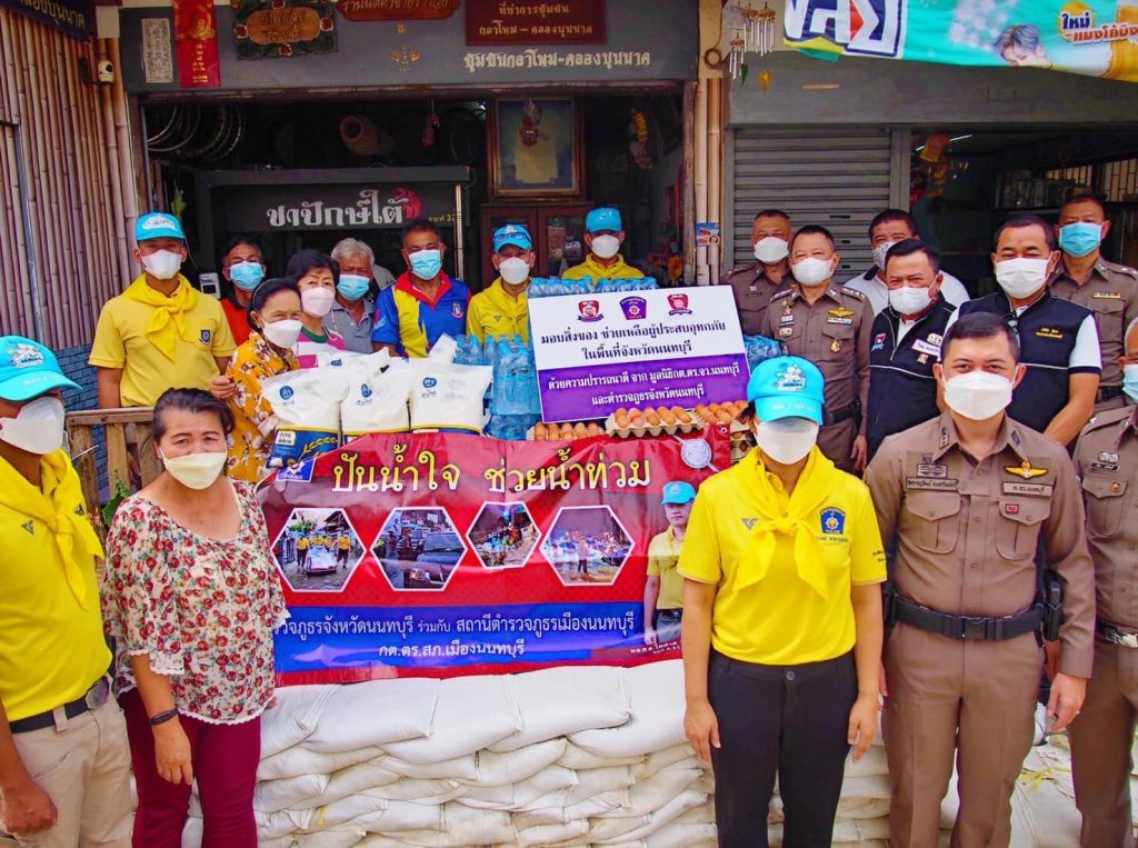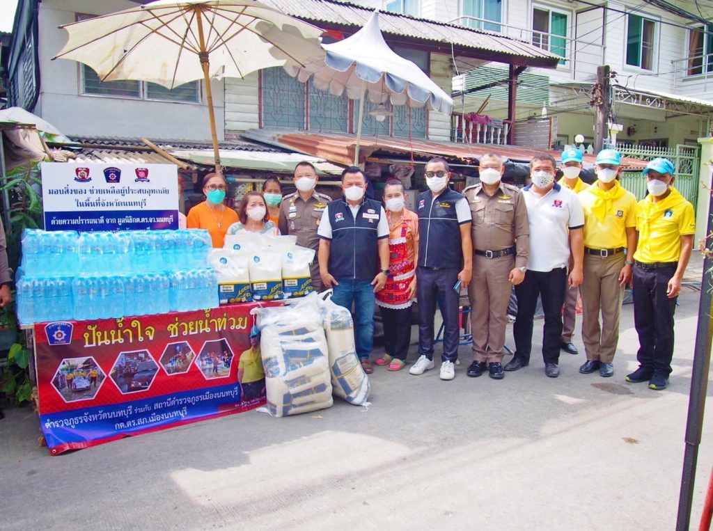 และคณะกต.ตร. สภ.เมืองนนทบุรี พร้อมกำลังเจ้าหน้าที่ตำรวจชุดจิตอาสา สภ.เมืองนนทบุรี จำนวน 30 นาย ร่วมกับ คณะ กต.ตร.สภ.เมืองนนทบุรี ร่วมแจกเครื่องอุปโภค บริโภค ให้กับประชาชน 5 เขตชุมชน ชุมชนละ 30 ชุด ประกอบด้วย 1.ชุมชนวันพลับพลาเขมา 2.ชุมชนกลาโหมคลองบุญนาค 3.ชุมชนวัดนครอินทร์ 4.ชุมชนซอยแสงเทียน 5.ชุมชนวัดบางขวาง รวม จำนวน 150 ชุด ที่ได้รับผลกระทบจากอุกทกภัย ในพื้นที่ของ สภ.เมืองนนทบุรี