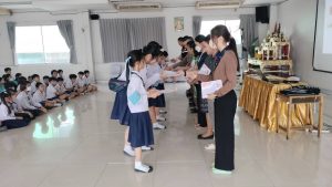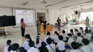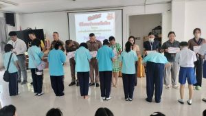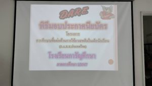 ร.ต.ต.ดร.ภาคิน ศีลธรรม รอง สว.(ป.) สภ.เมืองนนทบุรี พร้อมคณะ ครูตำรวจ D.A.R.E. สภ.เมืองนนทบุรี พร้อมผู้บริหารสถานศึกษา โรงเรียน การันศึกษา จัดกิจกรรมมอบวุฒิบัตร ให้กับนักเรียนที่ผ่านการเรียนการสอน ตามโครงการ การศึกษาเพื่อต่อต้านการใช้ยาเสพติดในเด็กนักเรียน ( โครงการ D.A.R.E.ประเทศไทย) มอบทุนการศึกษา รางวัลประกวดเรียงความดีเด่น มอบของที่ระลึกให้กับ ผู้แทนสถานศึกษา มีนักเรียน เข้าร่วมกิจกรรมจำนวน จำนวน 150 คน ณ ห้องประชุม โรงเรียน การันศึกษา ตำบลสวนใหญ่ อำเภอเมืองนนทบุรี จังหวัดนนทบุรี. @”สร้างภูมิคุ้มกันป้องกันยาเสพติด”