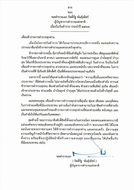 17 ตุลาคม 2567 “วันตำรวจ” 17 ตุลาคม 2567 โดย Admin / ข่าวประชาสัมพันธ์,ข่าวกิจกรรม,ข่าวประชาสัมพันธ์ 🔸เนื่องในวันตำรวจ 17 ตุลาคม 2567🔸 พล.ต.อ.กิตติ์รัฐ พันธุ์เพ็ชร์ ผู้บัญชาการตำรวจแห่งชาติ ส่งสารถึงข้าราชการตำรวจทั่วประเทศ ขอให้ร่วมแรงร่วมใจทำหน้าที่ด้วยความซื่อสัตย์สุจริต ช่วยเหลือดูแลพี่น้องประชาชนด้วยใจบริสุทธิ์และเป็นธรรม