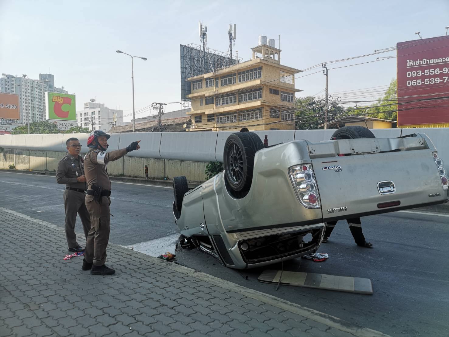 ศูนย์วิทยุนนทรี มีอุบัติเหตุ รถยนต์กระบะพลิกคว่ำ มีผู้ได้รับบาดเจ็บ เจ้าหน้าที่ตำรวจจราจรพร้อมกำลังร