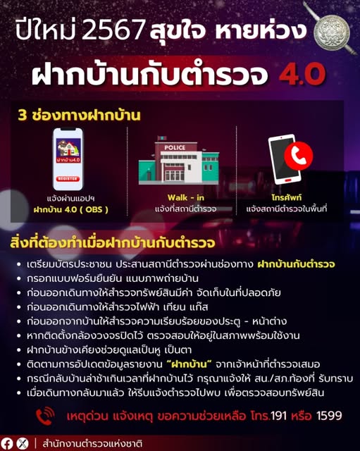 หยุดยาว เดินทางไกล ฝากบ้านไว้ให้ตำรวจดูแล . เริ่มแล้ว ฝากบ้านกับตำรวจ 4.0 ปีใหม่ 2568 สุขใจ หายห่วง
